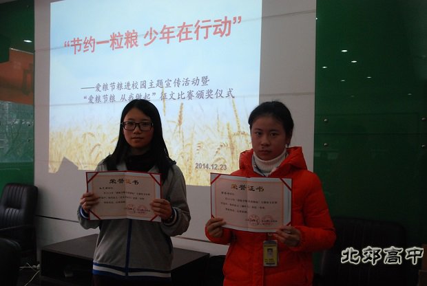 12月23日,我校团委钱志栋副书记带领获奖师生前往田家炳高级中学,参加“节约一粒粮 少年在行动”——爱粮节粮进校园主题宣传活动暨“爱粮节粮 从我做起”征文比赛颁奖仪式活动。颁奖仪式上,我校高二(6)班孙艺瑄、高二(15)班季雁彬同学分获省级征文获比赛一等奖和三等奖(全省一等奖共10名);高二(1)班虞辛怡、高二(2)班秦轶波同学获市级优秀奖;高二(1)班宋涵同学获市级三等奖;陈珊老师荣获省级优秀教师指导奖。北郊师生在本次征文比赛中斩获殊荣,为校争光,让我们向他们表示祝贺!