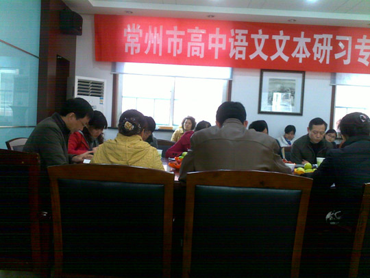 下午3:00,我们全体到会老师一起在行政楼二楼评课。研讨会由戚墅堰实验中学语文组教研组长虞超群老师主持。会上先由两位上课老师就自己的备课思路发言,然后来自各校的专家教师们针对这两堂课的教学效果和怎样进行文本研习等问题发表了自己的看法。现场讨论气氛热烈。