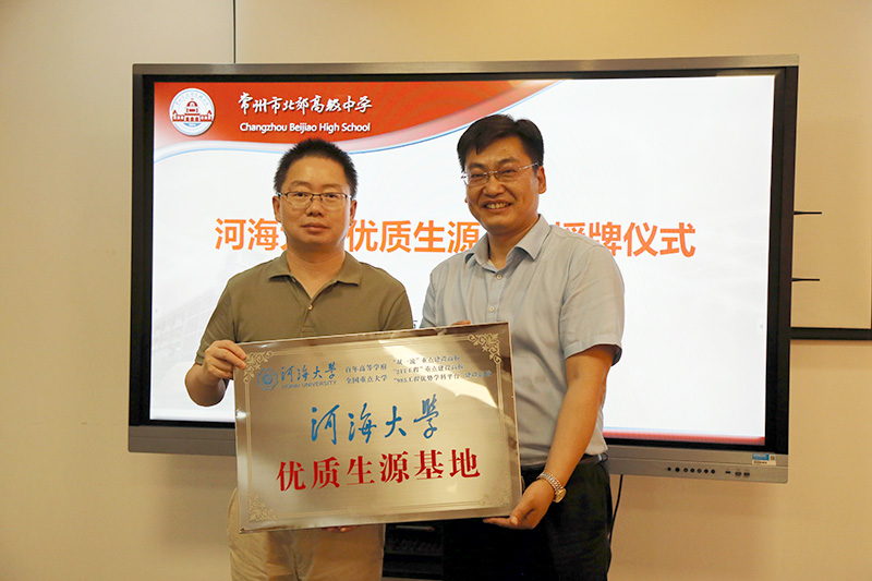 座谈交流环节,首先由曹新跃校长介绍我校办学情况,随后由河海大学招办主任介绍河海大学基本情况及北郊中学录取生源及发展情况。河海大学为我校授予河海大学优质生源基地铭牌。本次“双高”交流增进了两校的友谊,促进两校更好发展。