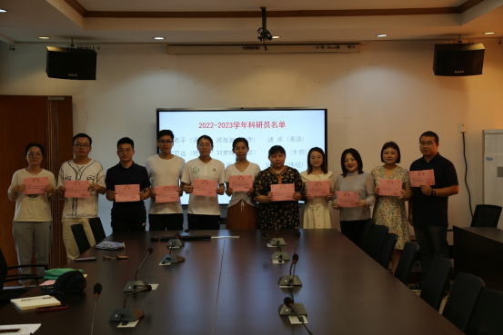会议开始,王俊主任根据科研员常规工作考核结果,对上一学年科研员工作进行了总结:各学科科研员均主持或参与了至少一项校级以上课题,且论文发表或获奖多篇,科研成果丰硕,各学科教师专业发展齐头并进。然后根据考核结果及个人意愿确定了新学期科研员聘任名单并颁发聘书。