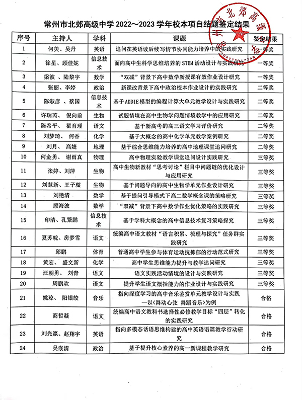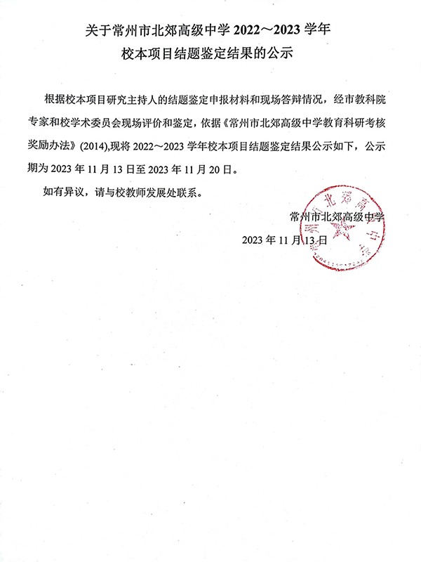 常州市北郊高级中学2022-2023学年度校本项目研究结题鉴定公示