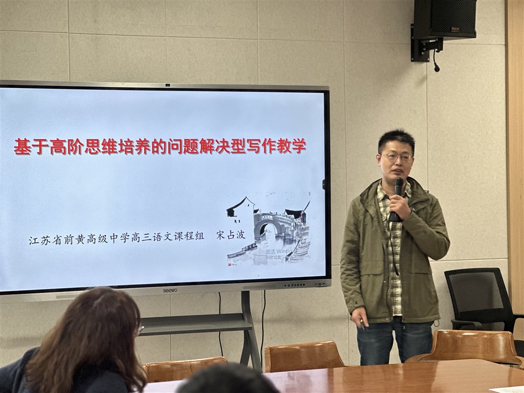 活动伊始,江苏省前黄高级中学高三语文学科组组长宋占波老师受邀作专题讲座。宋老师结合丰富的教学实践,强调了写作教学系统化与课程化的重要性,提出应立足学情,实施精细化指导,促进学生写作能力的稳步提升。