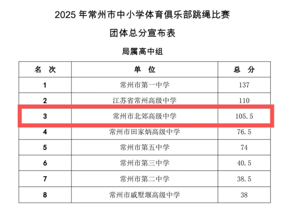 2025年11月30日,常州市中小学体育俱乐部跳绳比赛总决赛在勤业中学激情开赛。常州市北郊高级中学跳绳队首次组队参赛便崭露锋芒,凭借扎实功底与顽强拼劲,最终斩获局属高中组团体第三名!