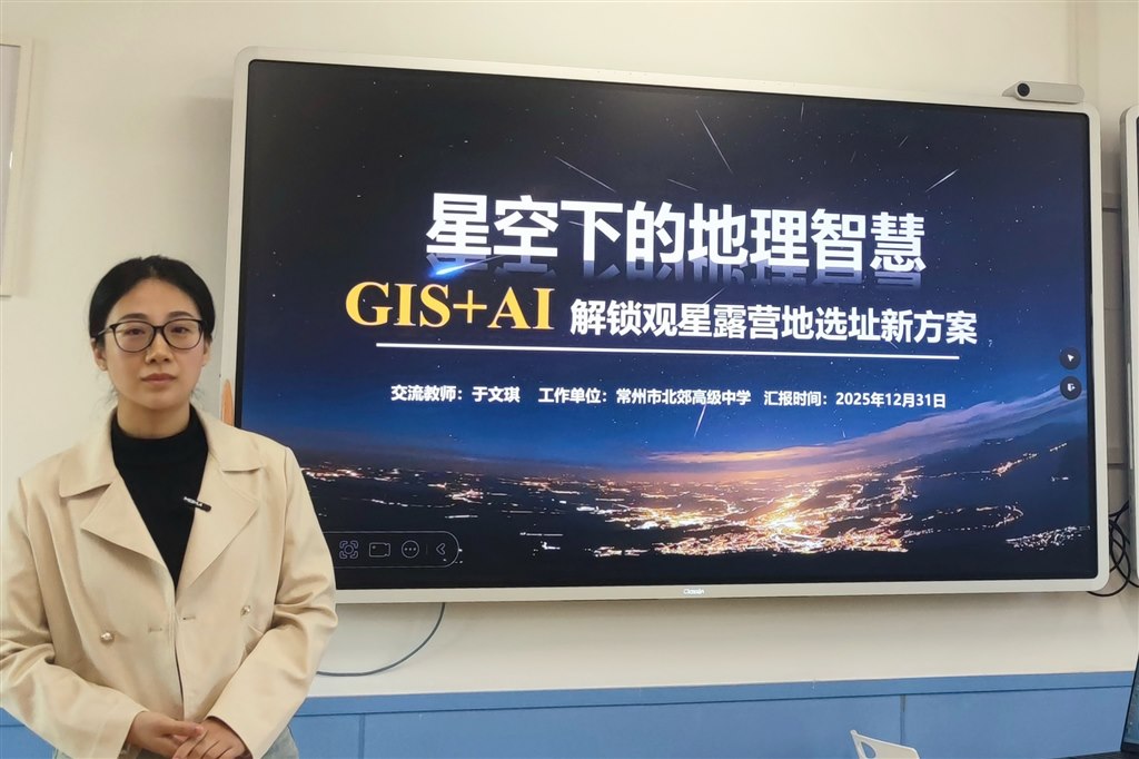 在优秀案例分享环节,于文琪老师以“星空下的地理智慧”为主题,带来《GIS+AI解锁观星露营地选址新方案》的精彩分享。她以“天文社校园悬赏令”为趣味切入点,引导学生运用ArcGIS软件与AI技术建立综合评价指标体系,系统分析地形、气象、环境等影响露营地选址的关键因素,展现了地理学科在现实问题解决中的实用价值。其创新的教学设计与严谨的探究逻辑,赢得了现场专家与同行的一致好评。