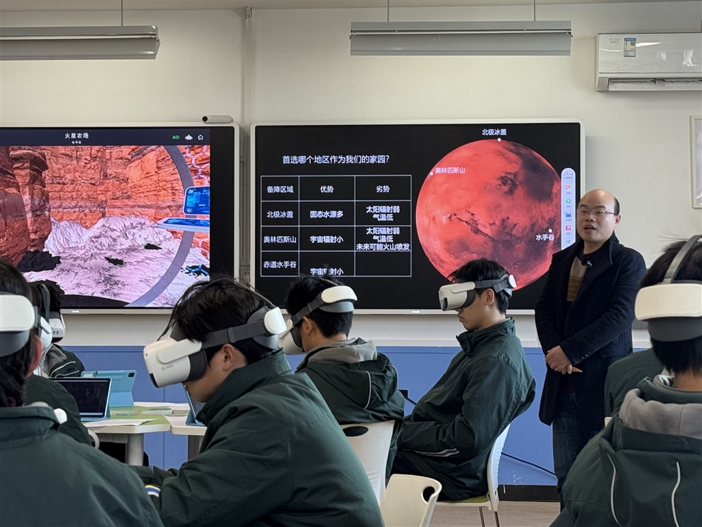 在观摩课展示环节,戴文斌老师以《火星农场》为题,运用VR(虚拟现实)技术打造沉浸式教学场景。课堂中,学生“置身”火星地表,在虚拟环境中开展自然考察,并通过虚拟仿真程序量化光照、气温等核心参数,模拟火星极端环境下的农业种植实验,将抽象的地理原理转化为直观可操作的探究任务,充分激发了学生的科学探究热情,获得了专家们的高度赞誉。