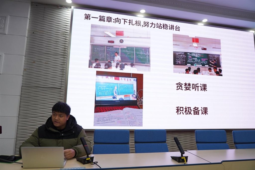 2024年入职的物理组王斌老师以《向下扎根,向上生长》为题,分享了自身成长经历:通过听课备课、对话式批改作业扎牢专业根基,借助建设个人题库提升教学能力;同时主动承担年级事务、探索班级管理方法,积极参与教研课题与论文写作,在实践锻炼中拓宽教育视野,稳步实现专业成长。